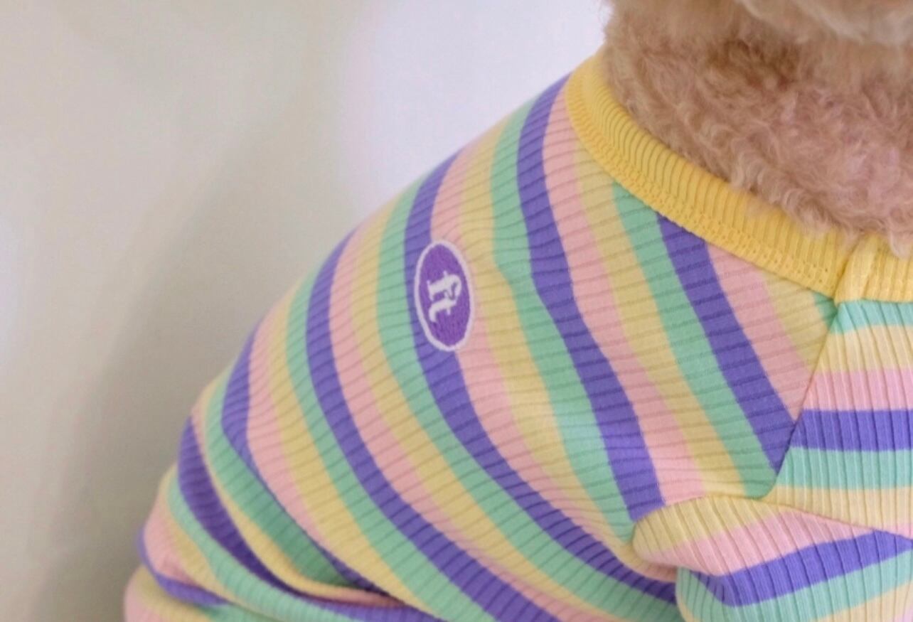 ストライプトップスのカジュアルでキッチュな