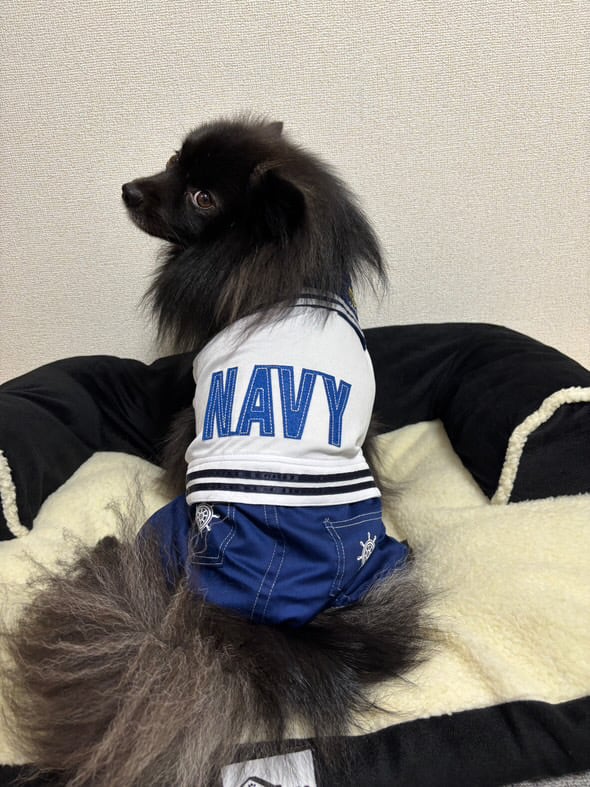 モデルはポメラニアンのせざむくんXXLサイズ着用